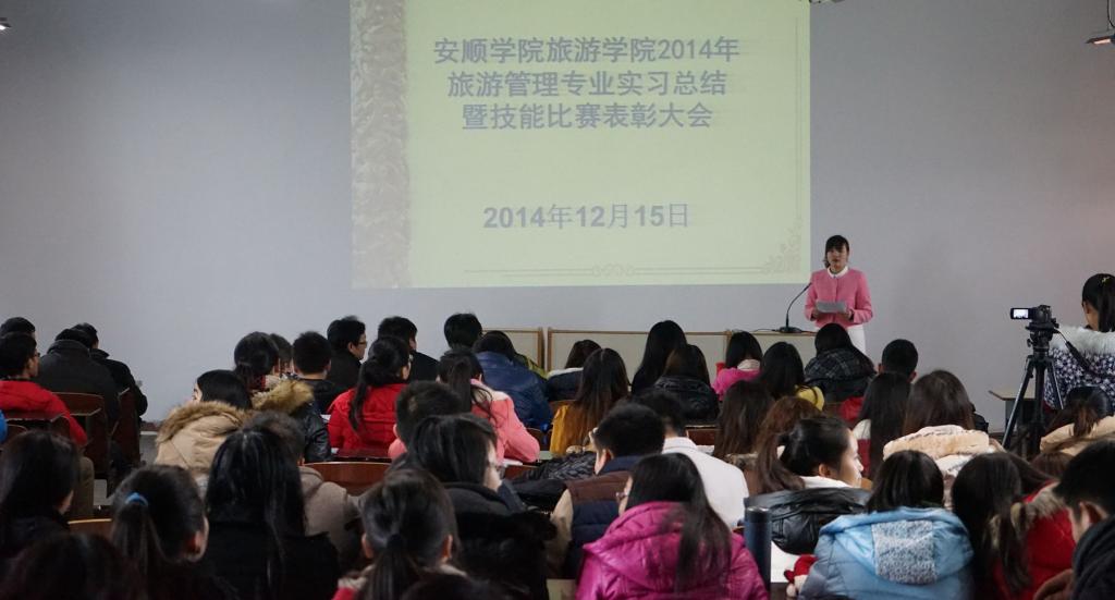 12月15日下午,公司在951教室召开2014年旅游管理专业实习总结暨实习技能比赛表彰大会。公司经理吴羽教授,党总支书记胡赤兵副教授,副经理赵世钊副教授、潘昌盛副教授及相关老师出席本次会议。2011级、2012级旅游管理本科班和2012级旅游管理专科班二百余名员工参加了会议,2012级旅游管理本科班黄容同学主持会议。