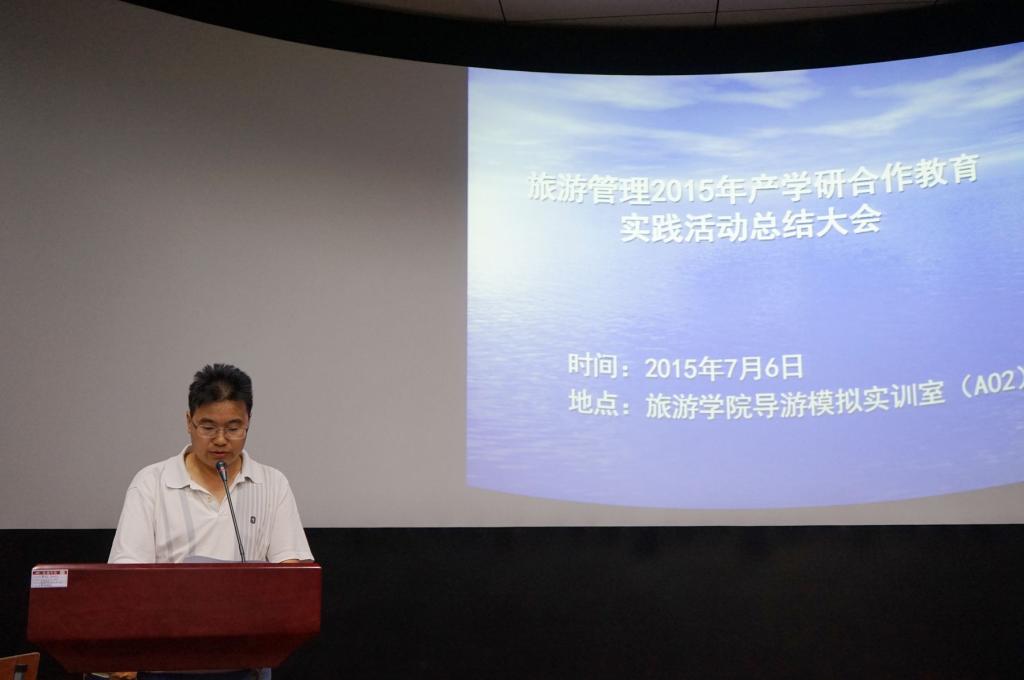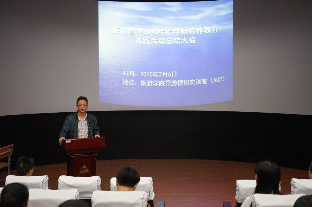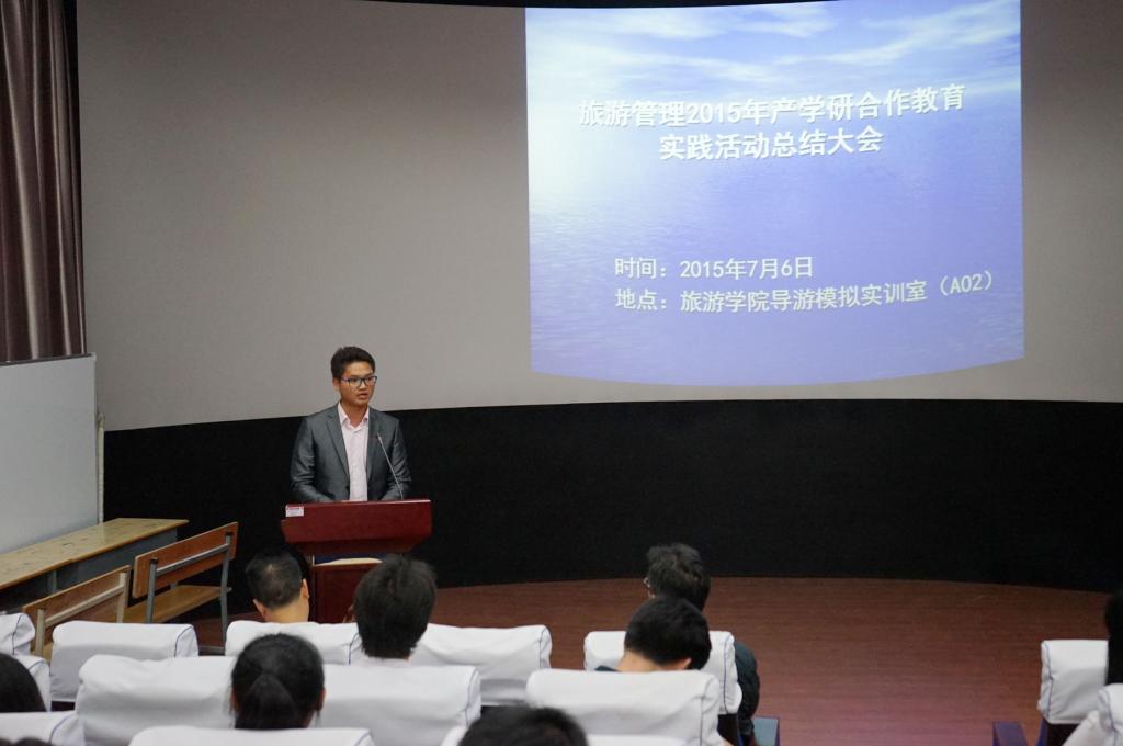 2015年7月6日下午3点,公司在A02教室召开2015年旅游管理专业产学研合作教育实践活动总结大会。公司经理吴羽,副经理赵世钊、潘昌盛以及相关教师出席活动,2013级旅游管理班全体同学参加会议。会议由2013级旅游管理班卢嘉礼同学主持。