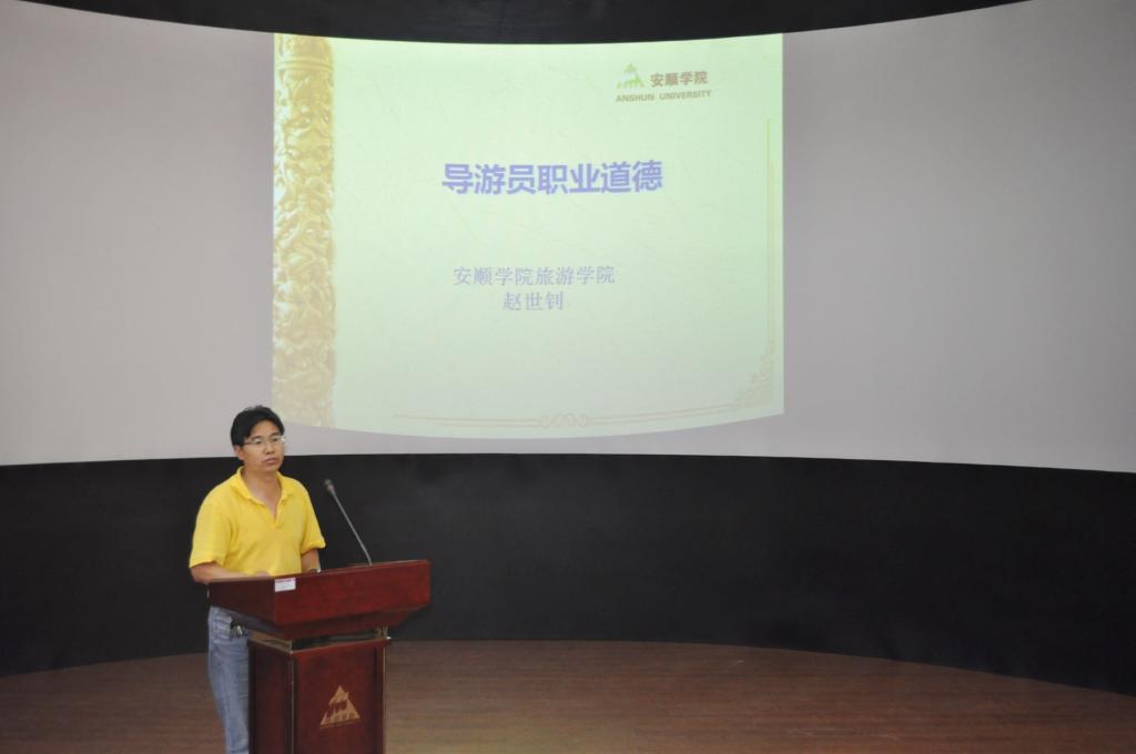 2015年6月30日下午2:30,2015年度安顺导游员继续教育培训(含岗前培训)——“导游员职业道德”主题讲座在公司A02教室举行,主讲人为公司副经理赵世钊老师。安顺市导游员和公司取得导游资格证员工聆听了此次讲座。